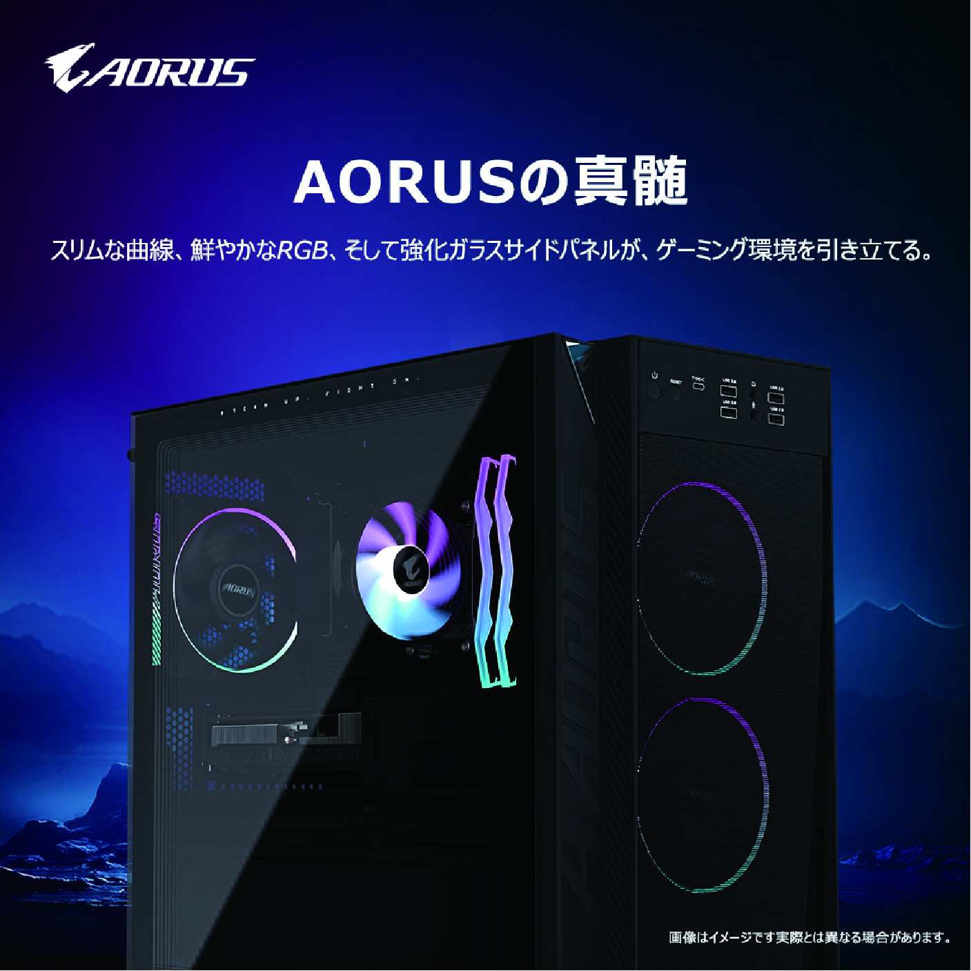 PCケースには、前面に2基、背面に1基の120mmファンを備え、80%メッシュ構造に加え、サイドにベントを設けることで効率的な排熱を可能にした独自設計のモデルを採用。さらにARGBファンを搭載した大型の空冷クーラーと組み合わせることで、高性能なCPUの性能を最大限に引き出します。また、本製品に搭載されるファンには、航空技術を応用したファン設計により風量や圧力を向上させるとともに、静穏性も高めたGIGABYTE独自のHawk Fanを搭載。激しいゲームプレイでも静音性を保ちます。PCケースの3つの120mmファンはARGB LEDリングを搭載、空冷クーラーのファンはブレード部にARGB LEDを備えており、システムを好みのライティングで彩ることができます。